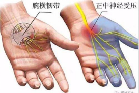 腕管综合征,俗称“鼠标手”,是腕管内组织压迫到正中神经,而导致腕管内压力增高。以手指的拇指、食指和中指的桡侧三个半指头的感觉麻木,伴以鱼际肌的萎缩为主要表现的一种疾病。引起腕管综合征最常见的原因是长期劳损。